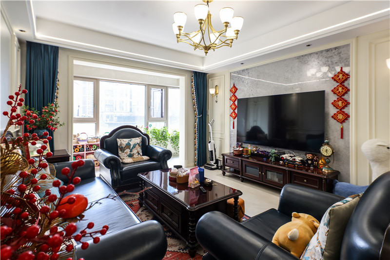 客廳兼具奢華與細膩感,其具有藝術(shù)感的裝飾物,透露出屋主對生活的精致要求;客廳紅木家具配合深色沙發(fā),深沉高雅;整面水漆背景墻+灰系電視背景墻,色彩層次感強。