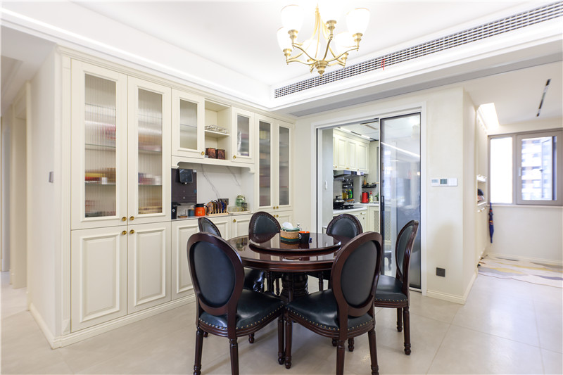 餐廚空間以推拉門做區(qū)隔,減輕油煙困擾;圓弧形配套餐桌,柔和之美下是高安全系數(shù);一字型餐邊柜,中部掏空預(yù)留來放水杯、飲水器等,存儲能力強。