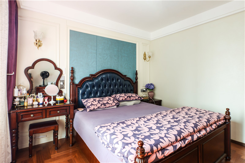 主臥:復(fù)古美式的雅致,是主臥空間傳達給人的韻味。床頭背景墻采用藍調(diào),形成拼色;床頭兩側(cè)古典樣式小吊燈,時尚奢華;一側(cè)床頭柜升級為梳妝臺,高級精致。