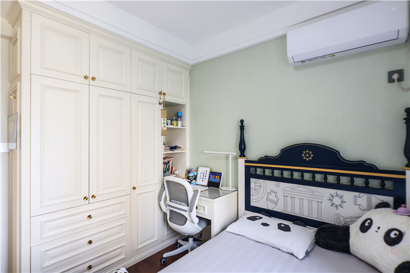 兒童房:床頭板樣式,讓人眼前一亮;衣柜延伸做書桌,協(xié)調(diào)自然;柜體設(shè)置為長衣、短衣及疊衣區(qū),明晰實用;整體兒童房色彩較豐富,守護孩子的童真童趣。
