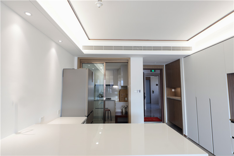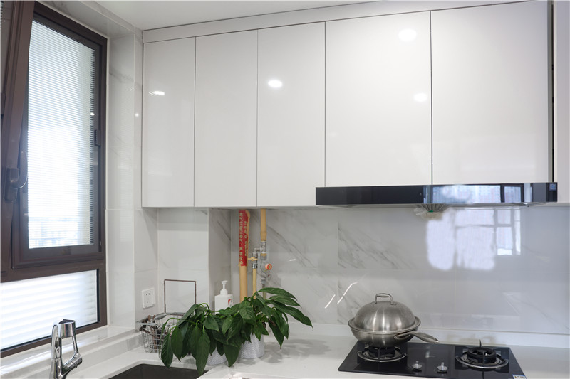 廚房貼墻而建呈小U字型構(gòu)造,無(wú)拉手設(shè)計(jì)使得整體視覺(jué)清新,簡(jiǎn)單幾平米的烹飪區(qū),動(dòng)線明晰、存儲(chǔ)在線。