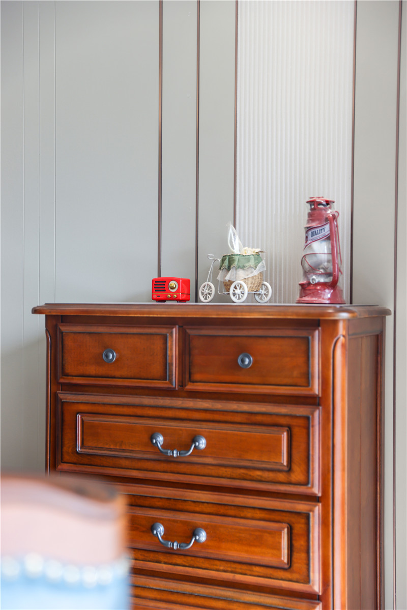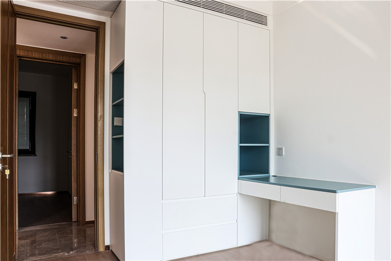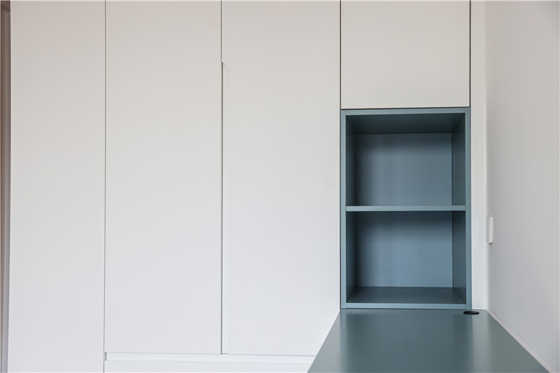 次臥:依舊采用整面到頂衣柜,一側(cè)薄側(cè)柜隔層放裝飾物,一側(cè)柜體延伸做床頭柜,以霧霾藍(lán)作為跳色,更顯活潑靈動(dòng)。