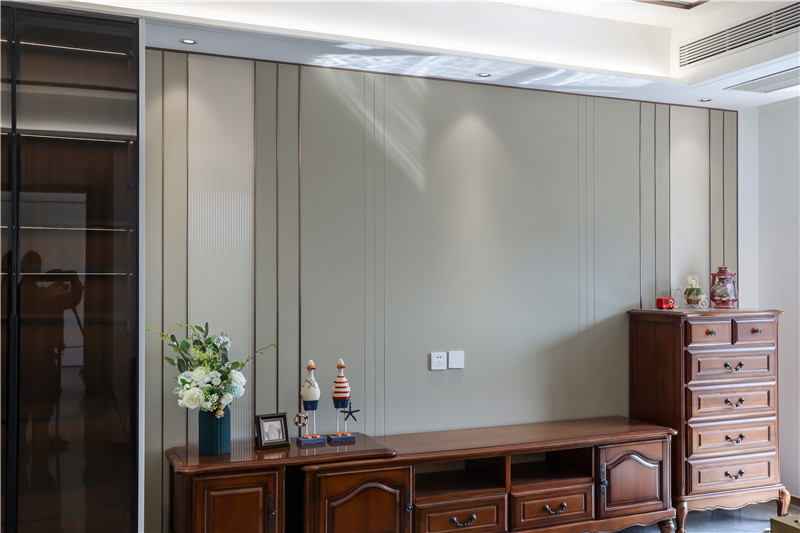 電視背景墻采用整面淺杏色背板,配以金屬色長(zhǎng)線條,彰顯時(shí)尚感;電視柜為一字型組合柜+獨(dú)立柜,深褐色滿滿的中古氣息,其實(shí)古銅樣式拉手與造型柜門(mén)組合,擁有高級(jí)質(zhì)感。