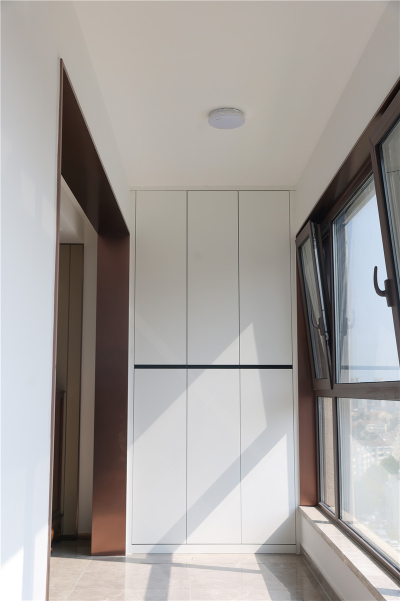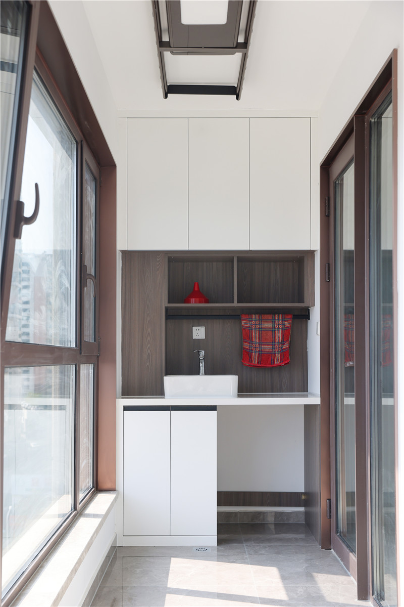 陽(yáng)臺(tái)一側(cè)做小型洗漱區(qū),有效避免上班、上學(xué)的洗漱時(shí)間沖撞,底部預(yù)留區(qū)可放洗衣機(jī);一側(cè)做整面到頂柜,可作為換季衣物存放區(qū);此空間柜體需注意柜體耐黃化及防水性。