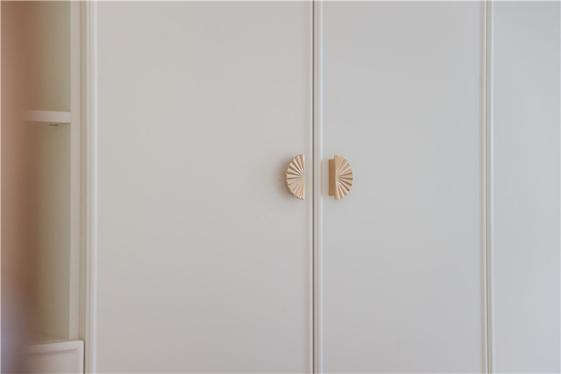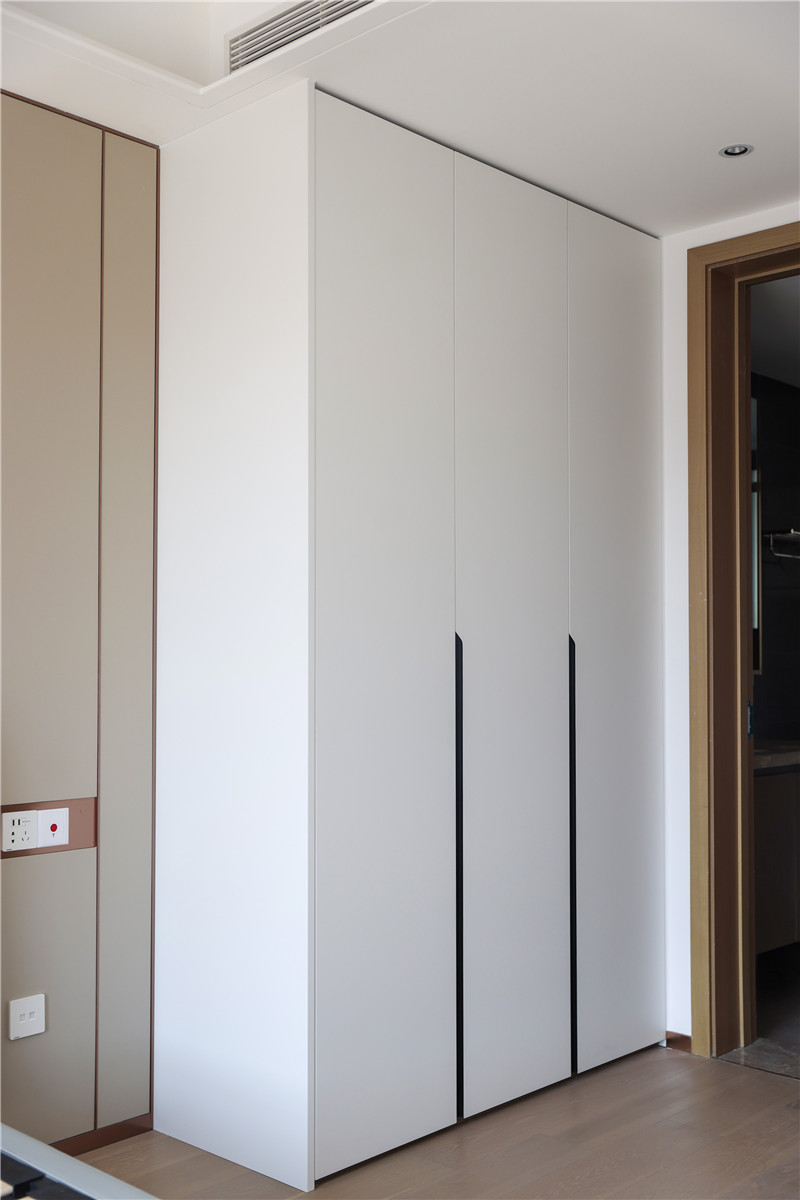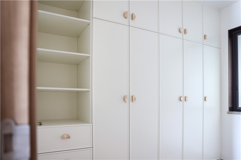 衣帽間整面到頂衣柜,芬蘭白OSB柜體,質(zhì)量靠譜;柜門(mén)耐磨、耐腐蝕、抗老化,美觀度高;裝飾性拉手為小扇子形狀,門(mén)板對(duì)稱,好看雅致。