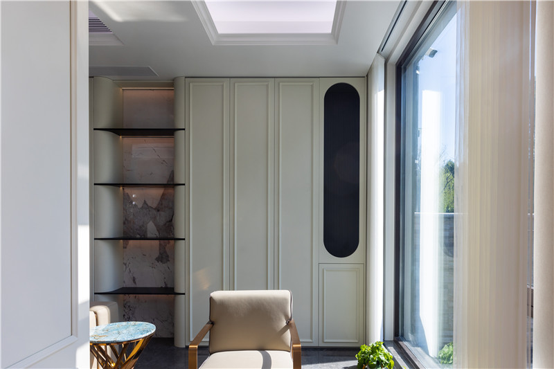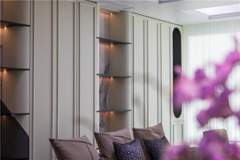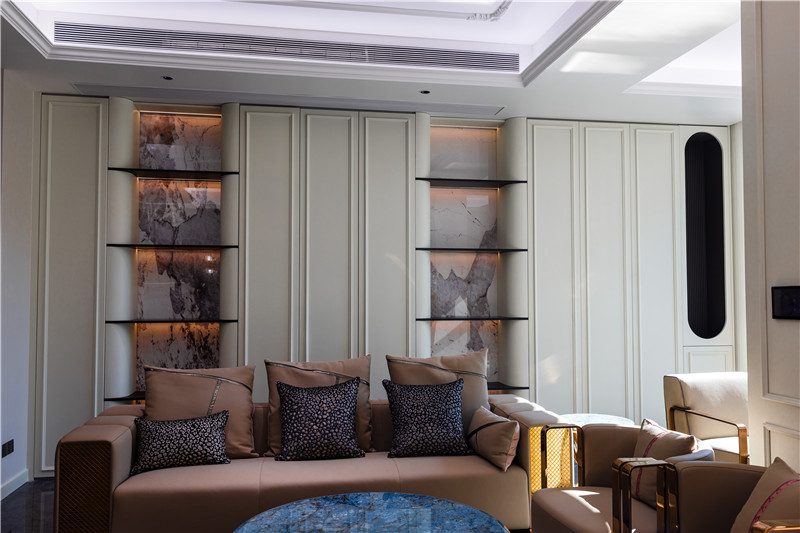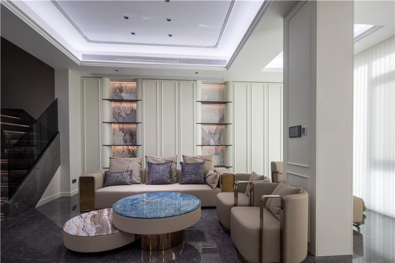 沙發(fā)后側整面背景墻以圓弧收邊,其間隔嵌入鋁型材隔斷配以暖系燈光及藝術背板,簡約舒適;茶幾深藍調亮光配以美拉德色沙發(fā),方圓之間致敬傳統(tǒng)古典法式。