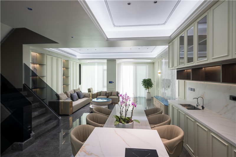 一樓為開放式構造,與自然連接互襯,安逸的充實感為空間的意象表達;整體大橫廳構造,一眼望穿的通透是大宅風范;光、線、色三者和諧,以居住體驗感證明。