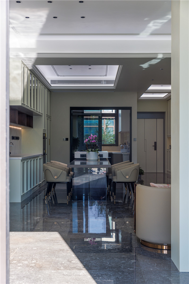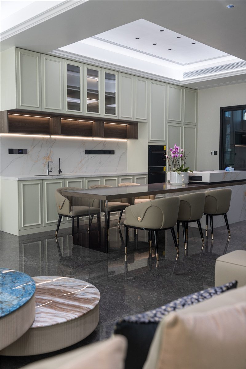 島臺延伸吧臺,既是用餐空間,也方便家庭成員共同參與其中;島臺臺面、烹飪留空處為大理石紋,彰顯高級質感。