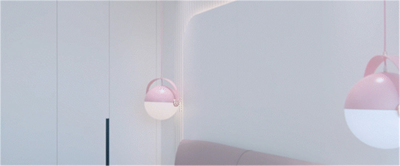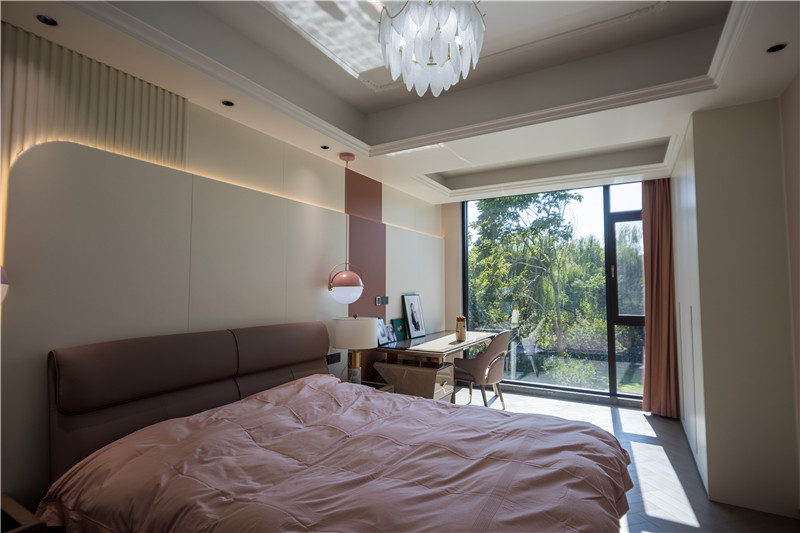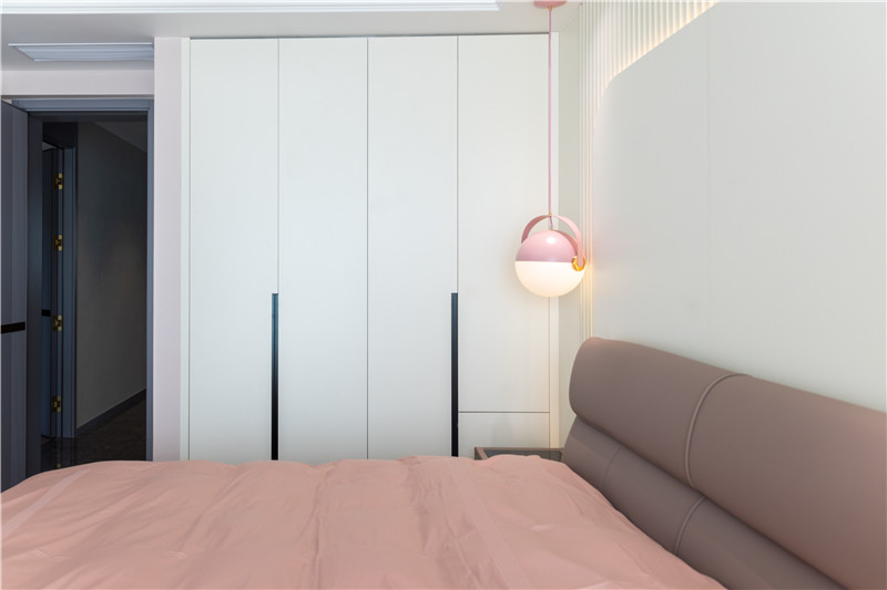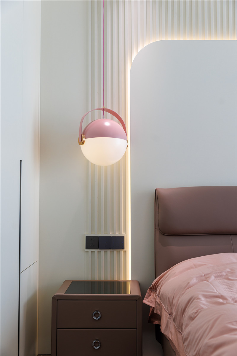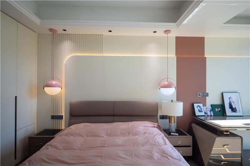床頭背景墻拼接式構造,內(nèi)里為格柵、外側為圓弧護墻板,用霧霾粉作為局部點綴,突顯層次美感;復古主燈與床頭兩側活潑粉系小吊燈配合,精致少女的小窩有了參考答案;到頂柜、懸浮床頭柜、精致梳妝臺三者美感在線,讓人心動!