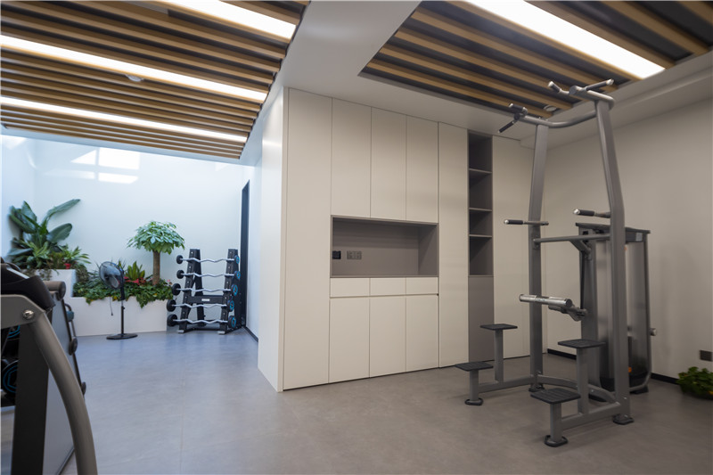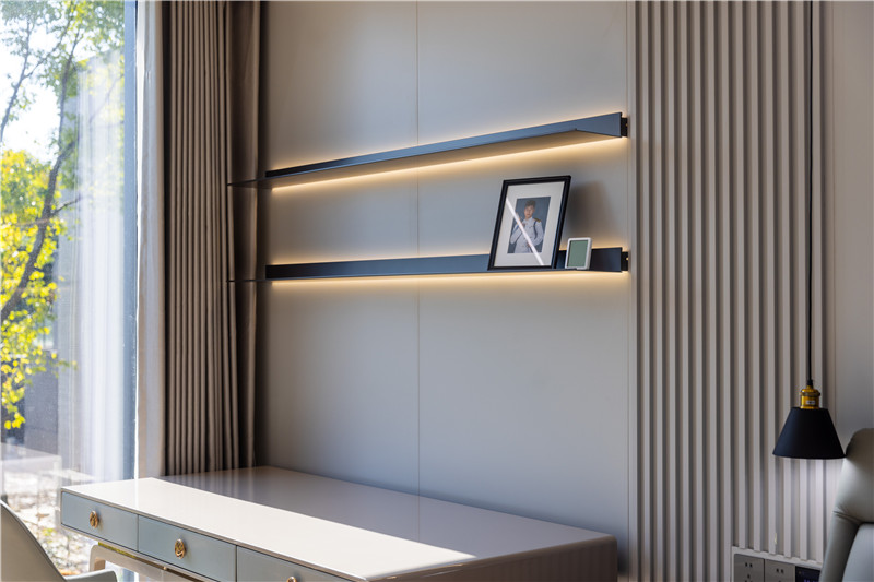 娛樂室以傳統(tǒng)構造成為家里的多功能性室,整面無拉手柜體簡單利落,背板以數(shù)碼板材展現(xiàn)特色性,空間構造的精益求精是客來福的裝修態(tài)度。
