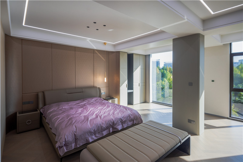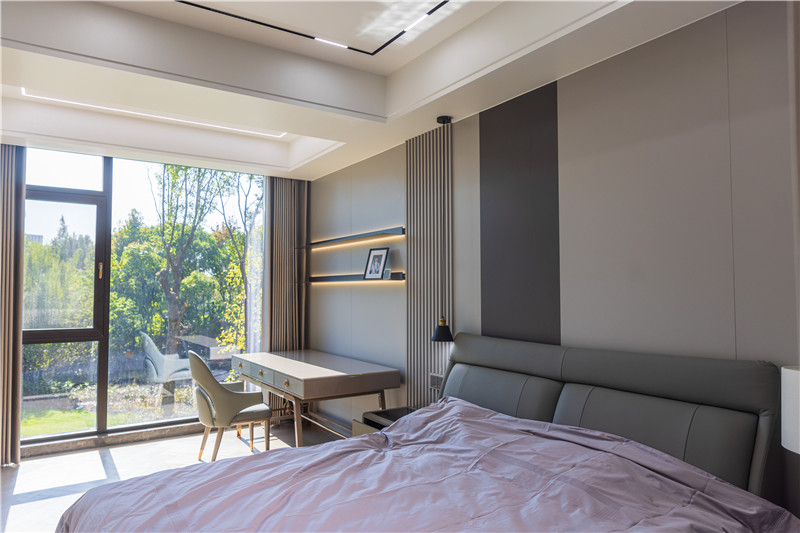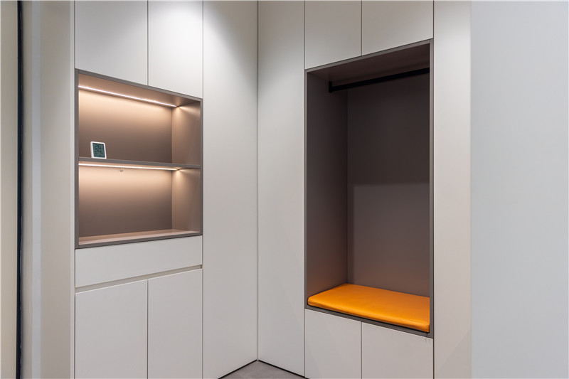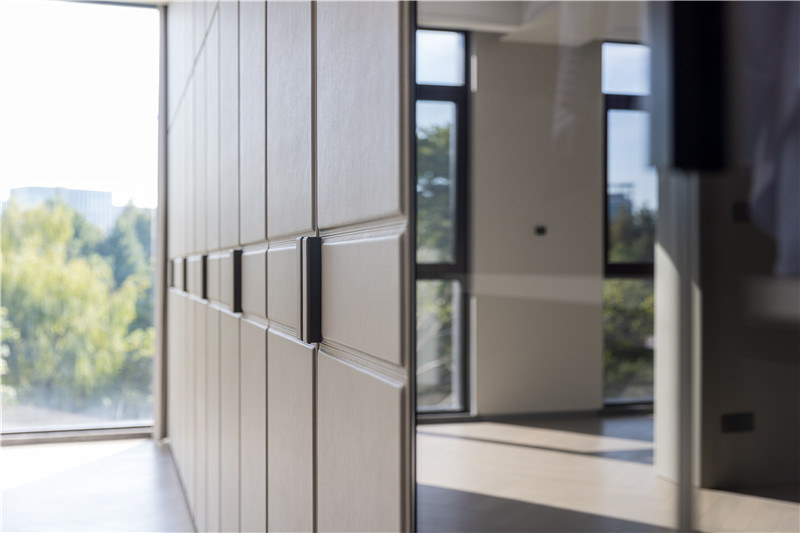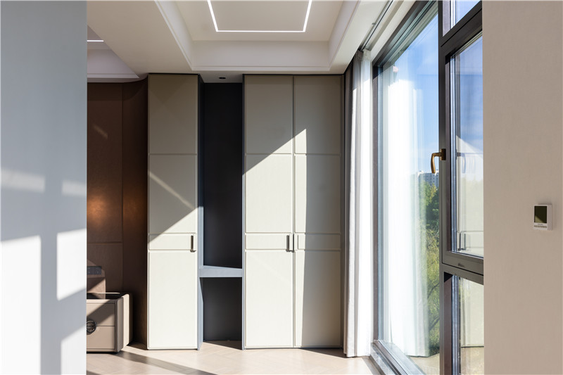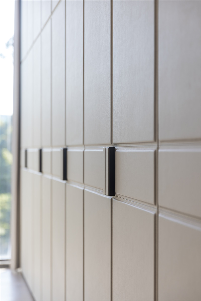 床頭柜圓弧結構,其白調襯托背景板杏調,加上環(huán)形藝術拉手,細節(jié)在線;臥室陽臺以穿插設計做到頂陽臺柜,和諧統(tǒng)一。