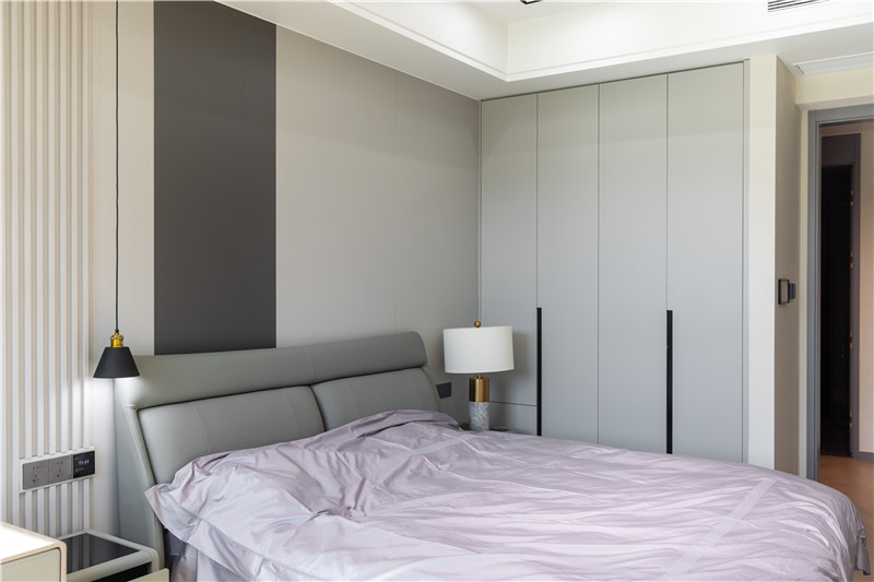 床頭背景墻跳色設計+縱向設計,拉升視覺;一側到頂衣柜芬蘭白色調配以黑色長拉手,顏值在線;一側桌面四邊圓弧收邊、抽屜采用小巧花形拉手彰顯精致,上方隔板為家里的DIY裝飾區(qū)。