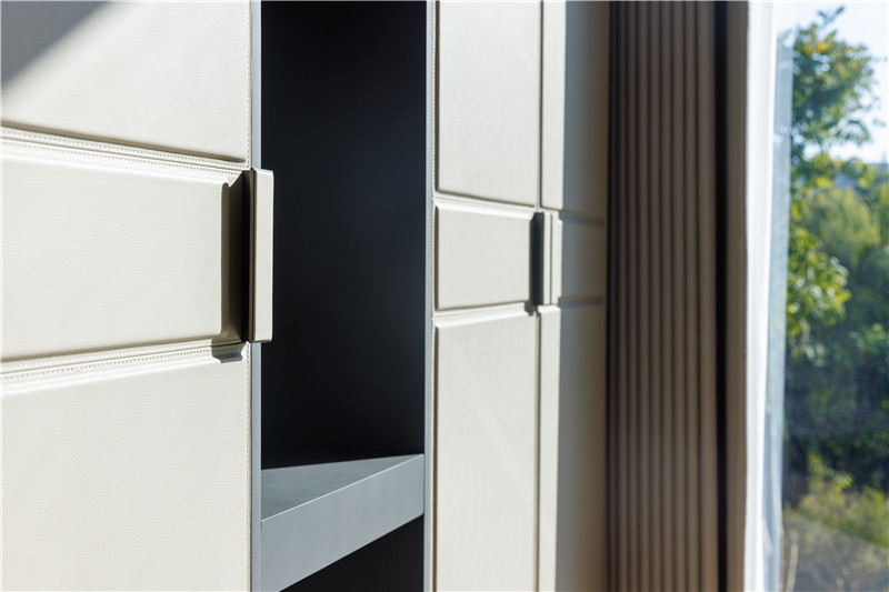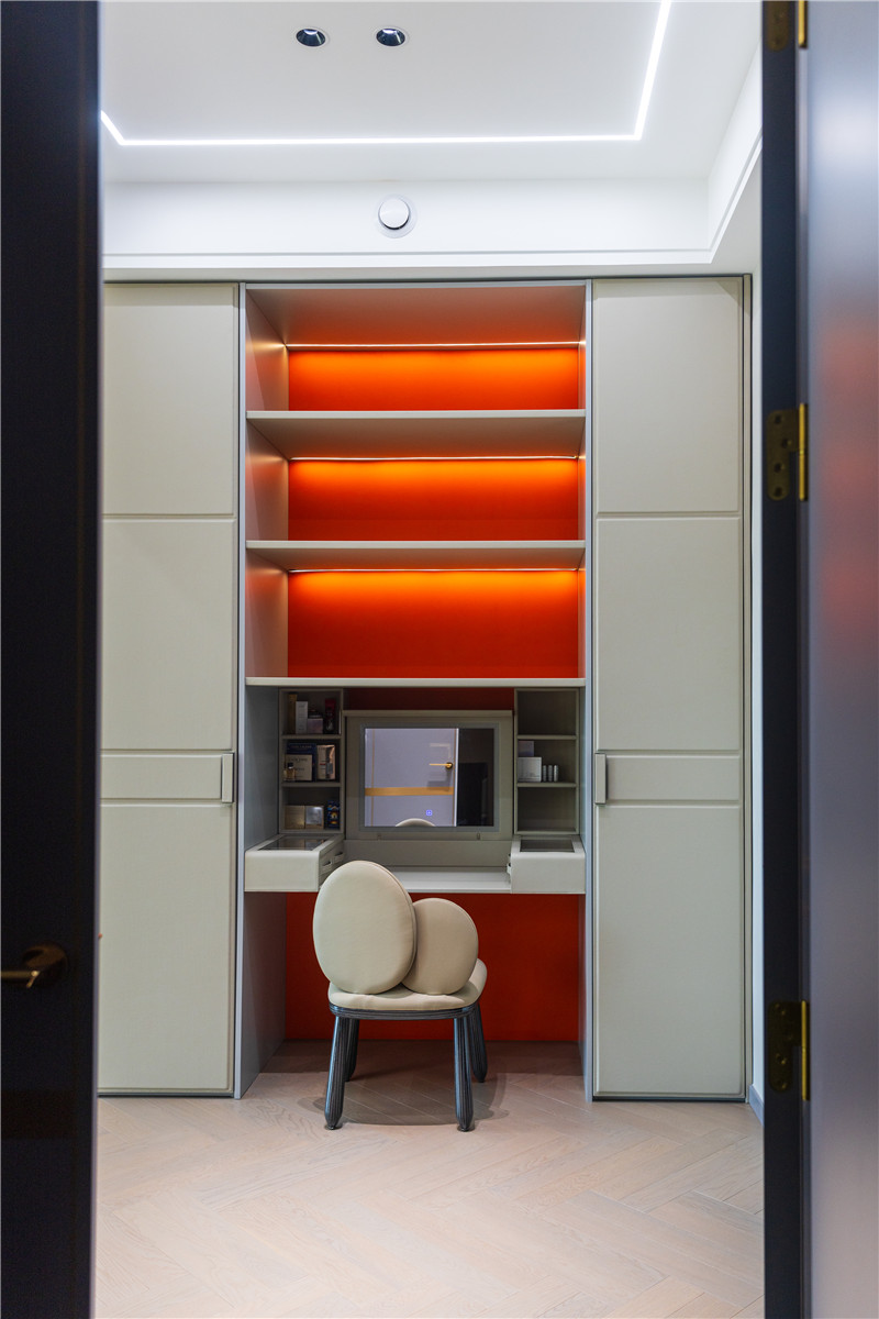 拉手、柜門采用皮革包邊,高端定制的品質直接看得見;皮革柜門、玻璃門組合式設計,視覺效果好;梳妝臺穿插臺面智慧構造、隔層背板采用活力橙,時尚好看。