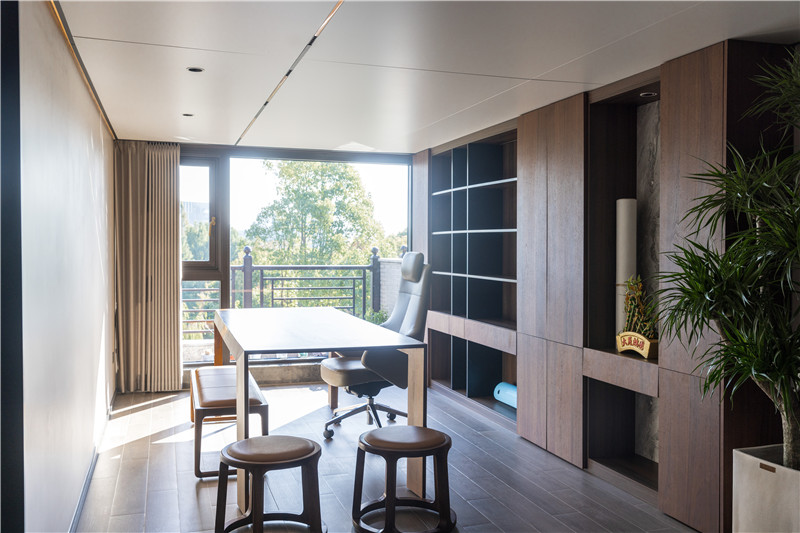 整體對稱構造,輔之以掛畫、擺件等元素,將千年的傳承與空間設計融合;柜體及書桌展示木的力量與美,需要品茶著親感;一字型整面組合柜遵循藏八露二原則,收納與美觀性兼具。