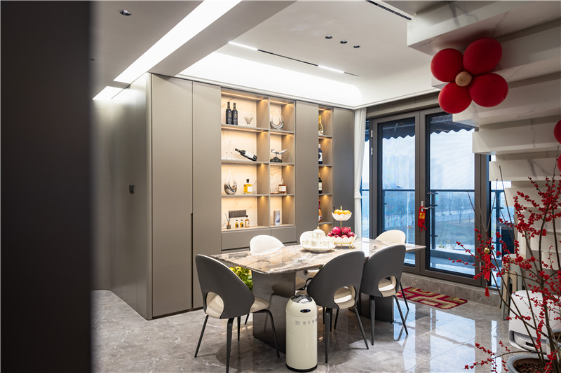 櫥柜柜體以簡(jiǎn)約黑拉手配以無拉手設(shè)計(jì),視覺上清爽利落;將烤箱、冰箱大電器嵌入高柜中,和諧布局;餐廚空間以推拉門做區(qū)隔,有效解決頑固污漬困擾,讓空間更加明亮干凈。