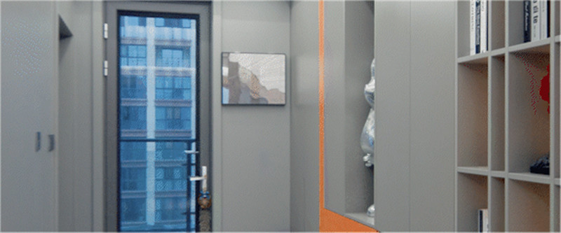 玄關(guān)柜到頂設(shè)計(jì),充當(dāng)家里的隔斷,優(yōu)化空間動(dòng)線。整體一字型構(gòu)造,以一抹橘調(diào)點(diǎn)色,穿插設(shè)計(jì)以設(shè)計(jì)感增強(qiáng)柜體美感。