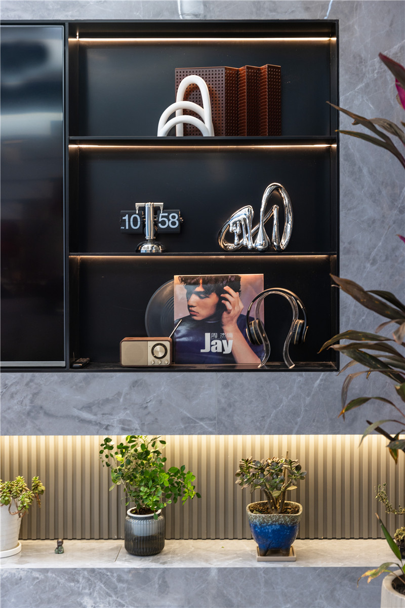 背景墻采用縱向格柵及跳色,視覺感強(qiáng);大理石板、門板拼接,其挑高設(shè)計(jì)突顯層次感;電視機(jī)旁側(cè)協(xié)調(diào)裝飾柜,深色調(diào)縱深感強(qiáng)。