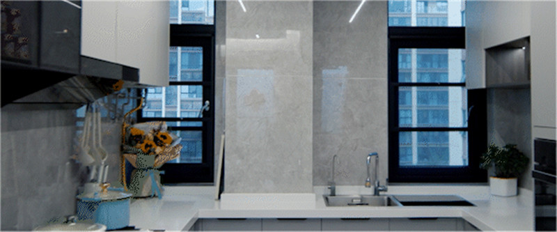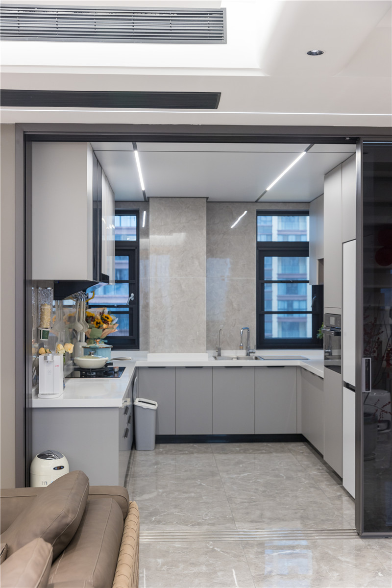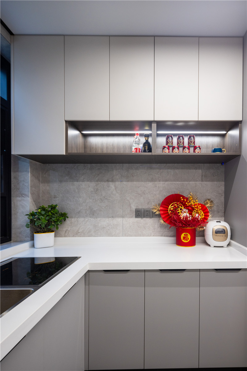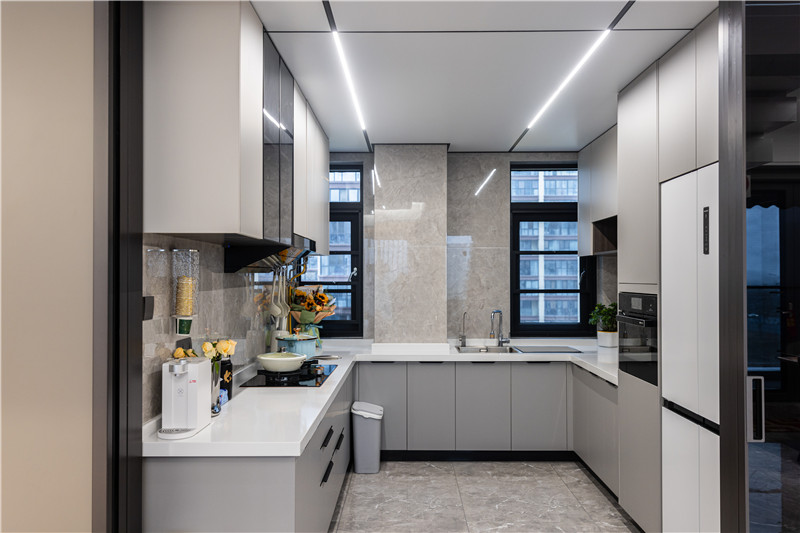 櫥柜以U型構(gòu)造合理利用空間,其灰調(diào)與白調(diào)配合,簡(jiǎn)約好看。洗→切→烹→盛的動(dòng)線,提升美食烹飪的效率。