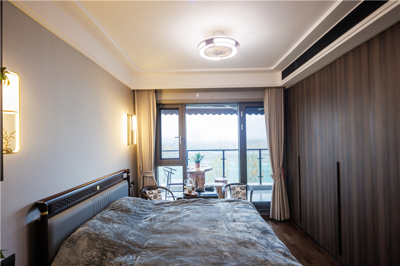 古典燈具+床頭板構(gòu)造彰顯雅韻;獨(dú)立陽臺(tái)+配套茶桌椅,悠閑生活輕松實(shí)現(xiàn);一字型頂天立地式衣柜,以合理分區(qū)滿足屋主的多重收納需求。