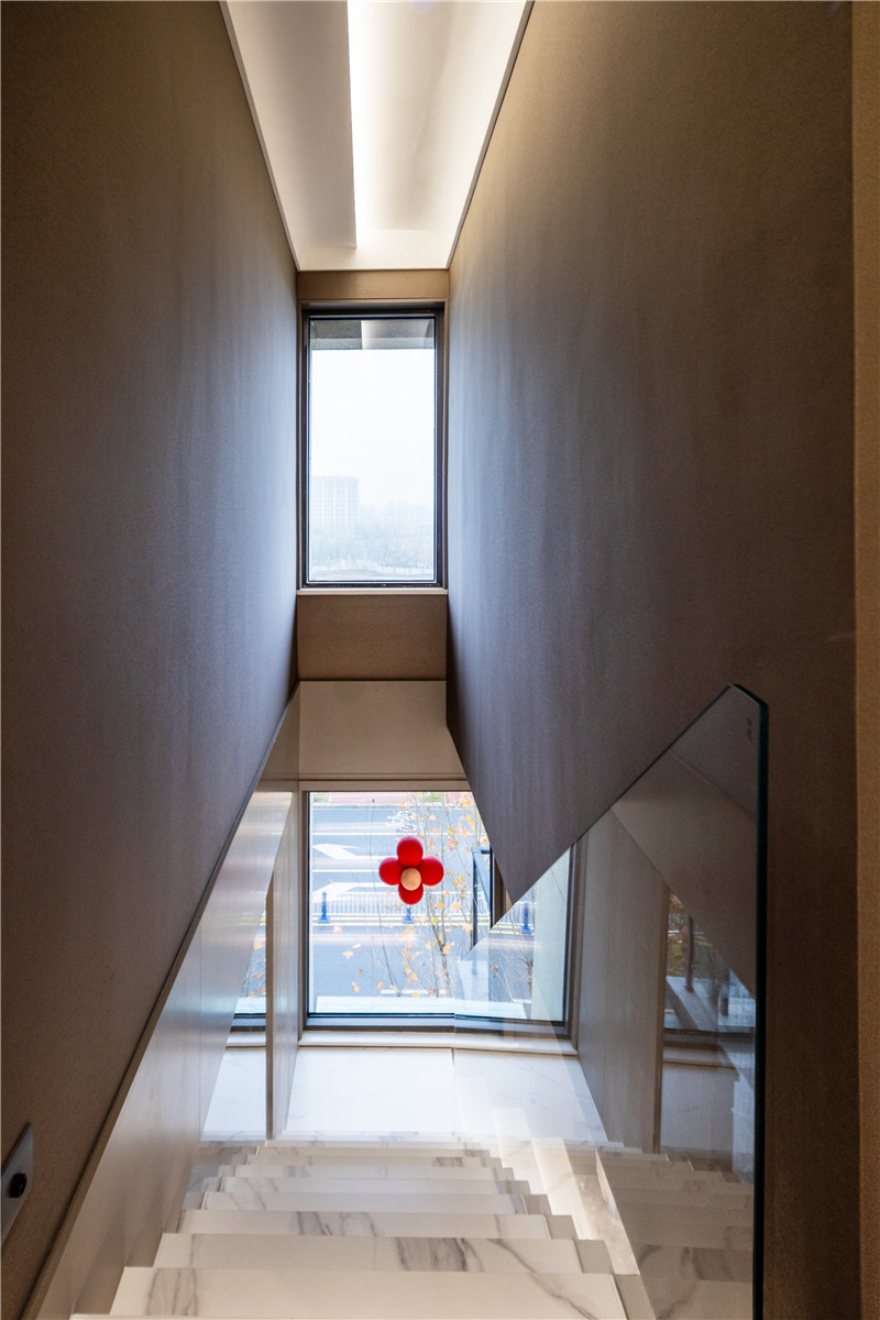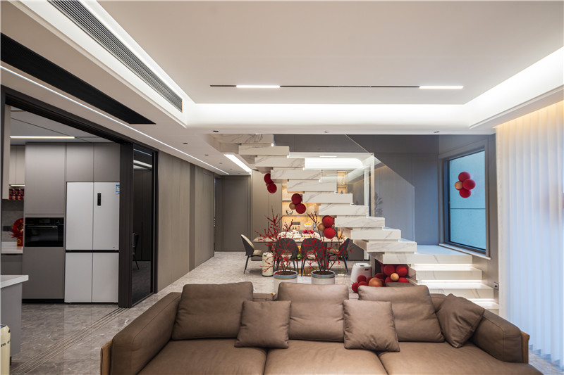 看完一樓的裝修,視線向上,高級(jí)特色的懸浮樓梯展大氣之勢(shì),若三五好友來家小聚,拍照打卡地就有了。樓梯做簡(jiǎn)單裝飾,下置用餐區(qū),氛圍感拿捏!