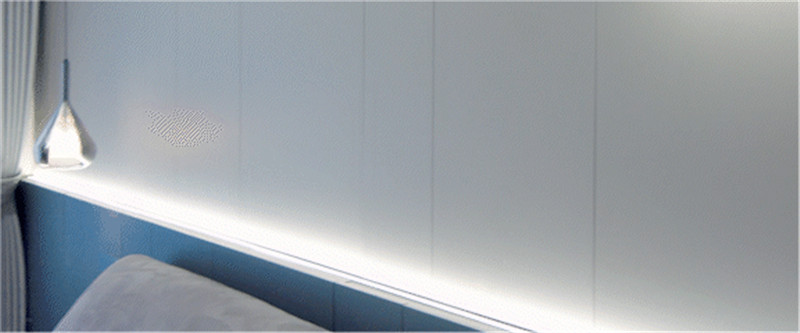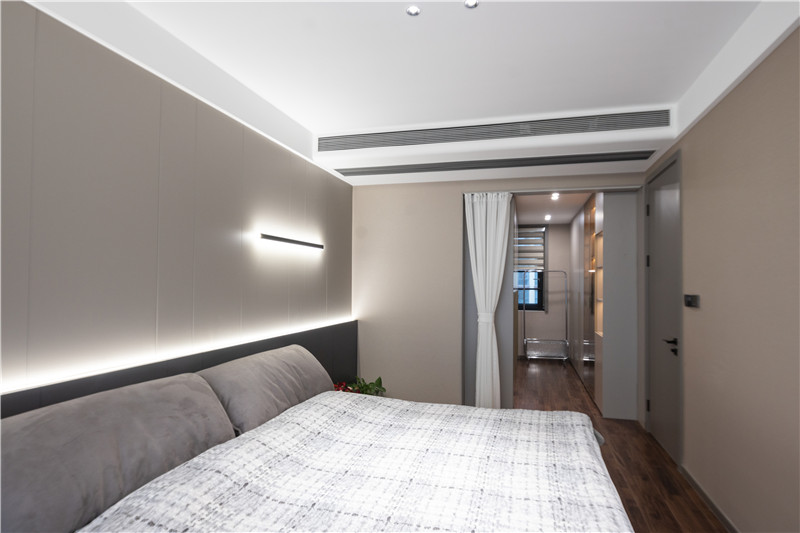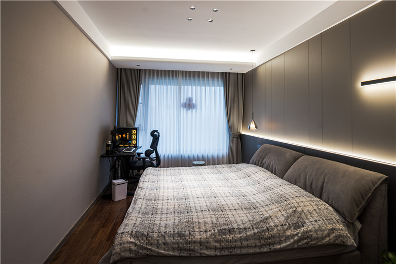主臥床頭背景墻采用拼接設(shè)計(jì),拼接處以燈光點(diǎn)綴,呼應(yīng)于藝術(shù)燈及局部燈光,滿滿氛圍感。