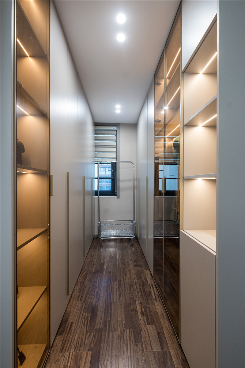 臥室側(cè)邊建立小型衣帽間,II型構(gòu)造有效利用狹長(zhǎng)區(qū)域,木柜、玻璃柜、展示柜組合,以藏八露二原則展現(xiàn)美感,其柜金屬色長(zhǎng)短拉手配合,好看且具備實(shí)用性。