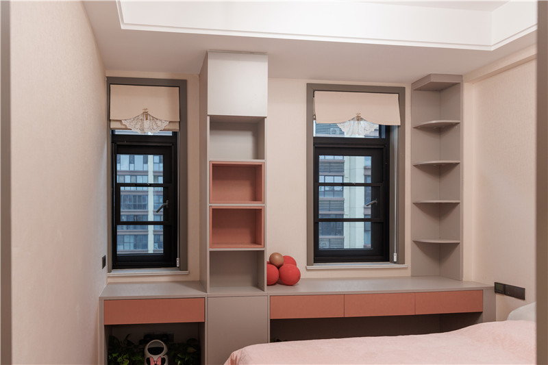 次臥以一體化設(shè)計(jì)有效節(jié)省空間,整體溫柔甜美,作為女兒房著實(shí)讓人心動(dòng)。