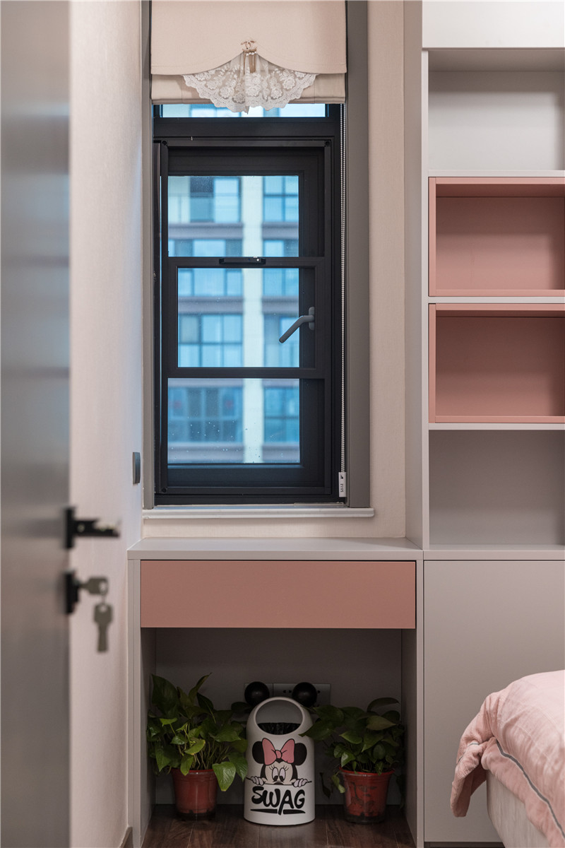 衣柜以霧霾粉作為跳色點(diǎn)綴,活潑靈動(dòng);靠墻圓弧展示柜,視覺柔和,是DIY區(qū),也是小物品收納區(qū);抽屜及底柜無拉手、桌面高度量身定制,空間利用率高。