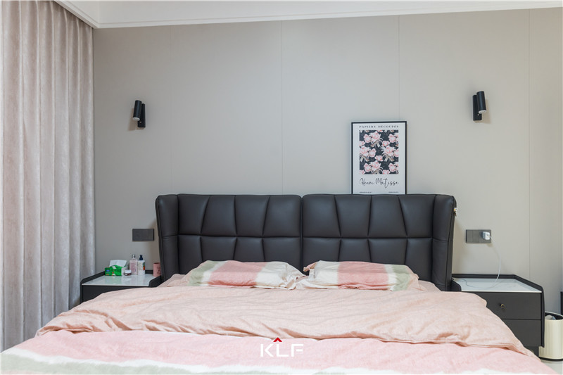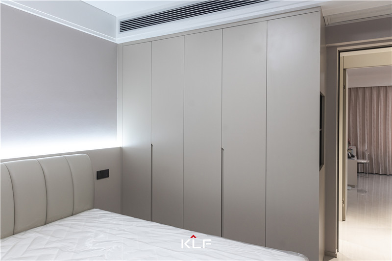 主臥以茶白調(diào)盡顯柔和溫潤。入門到頂式立柜協(xié)調(diào)拼接式床頭板、銑槽長拉手不占空間,靠窗建立小型書柜,靈活性強(qiáng)。