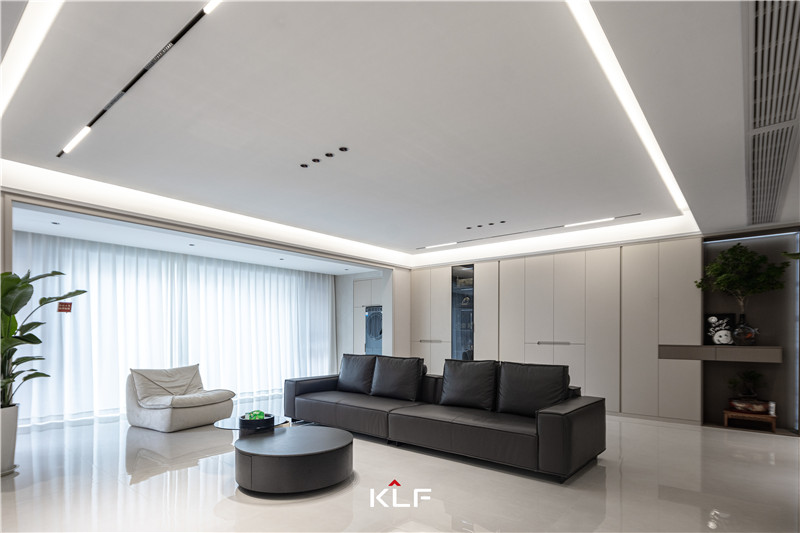 玄關(guān)中部及底部掏空,以人體工程學(xué)設(shè)計(jì)保障出入便捷度。茶白與檀木紋色彩拼接,射燈與輔助燈點(diǎn)綴局部,一整個實(shí)用住了。