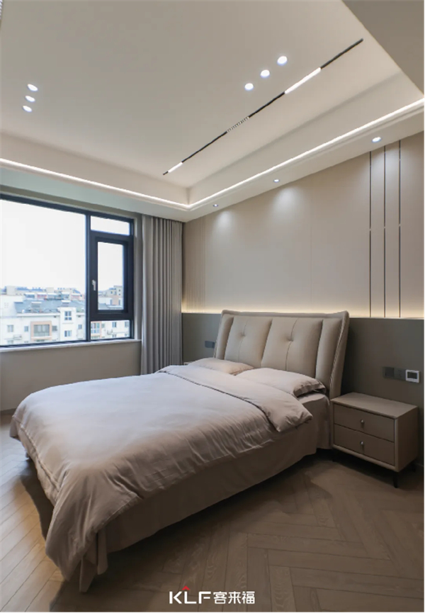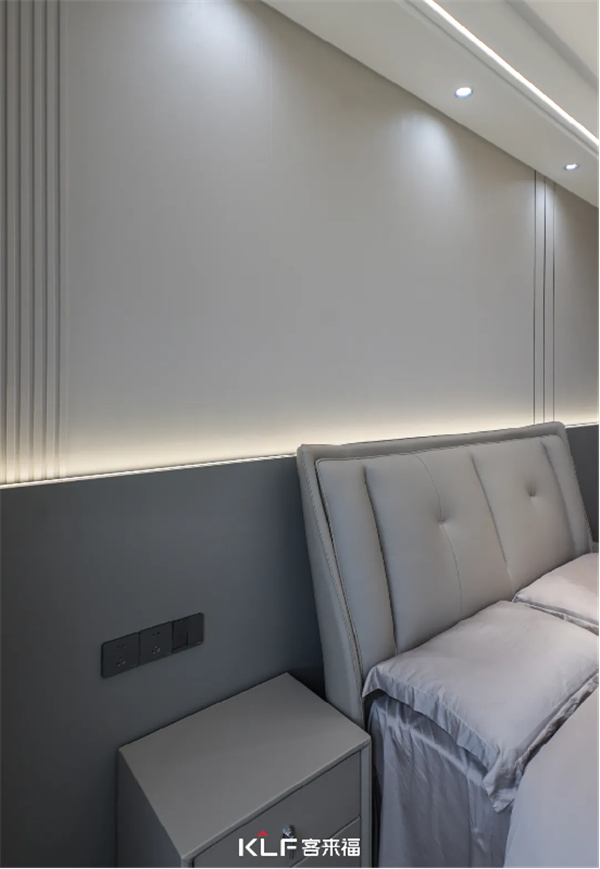沿用了暖咖色的床頭背景墻設(shè)計