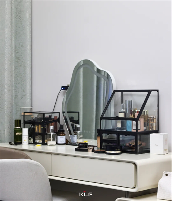 此外,一門到頂衣柜法式復(fù)古拉手等元素設(shè)計,給人一種輕盈、通透的感覺。懸空化妝桌設(shè)計更為巧妙,視覺更輕盈靈活,更具時尚高級感。