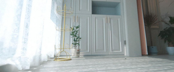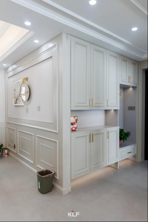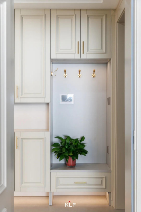 玄關(guān)入戶柜簡約純凈,在設(shè)計上采用“二八”原則,掛衣區(qū)、換鞋區(qū)精心布局,搭配頂部收納柜、鞋柜增加儲物功能。