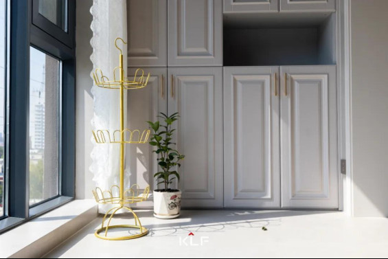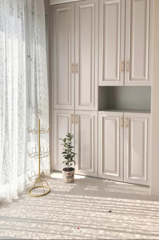 靠墻設(shè)計的水漆茶白陽臺柜兼顧收納和顏值,整墻簡約金屬拉手收納柜讓生活瑣碎變得井井有條,縱向立體化收納,搭配中間開放設(shè)計,可放置日常用品,便于拿取。