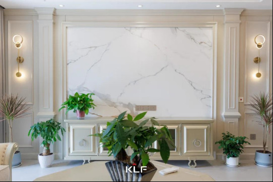 水漆茶白背景墻搭配巖板設(shè)計,細膩的紋理質(zhì)感,利落的線條,展現(xiàn)空間的復(fù)古簡約。兩側(cè)壁燈和頂部吊燈,渲染溫馨氛圍,打造現(xiàn)代簡約溫暖家。