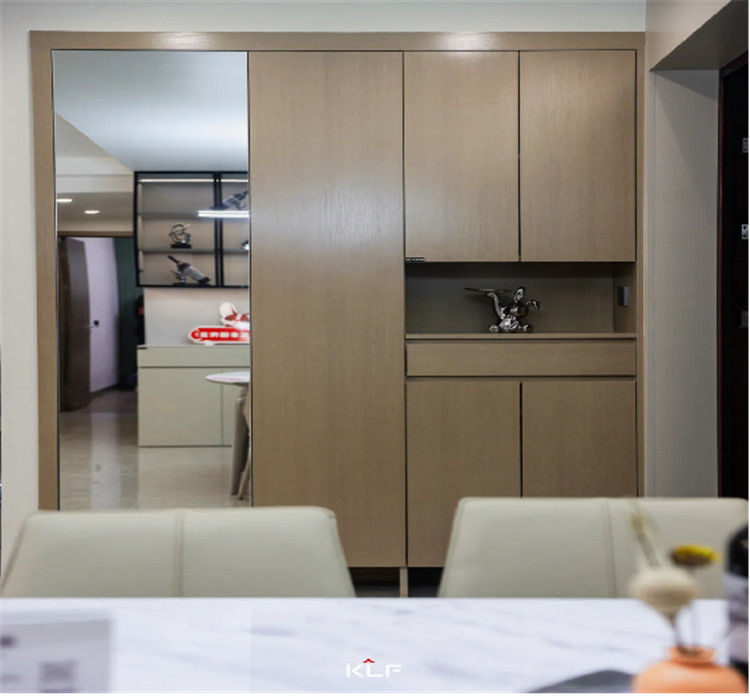 餐邊柜與護墻板色調統一,顯得空間和諧寬敞;玻璃吊柜內置燈帶,既起到調節(jié)大面積茶白色帶來的素凈氛圍,又很好呈現輕奢風強調的精致細節(jié);免拉手設計簡約實用,也減少日常磕碰。
