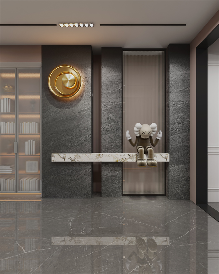 ?戶空間造景區(qū)與鞋柜相互呼應(yīng),精致的?虹玻璃作為情緒與視覺(jué)的點(diǎn)睛,填充空間空?的同時(shí),也衍生出生活美學(xué)的設(shè)計(jì)感與儀式感。