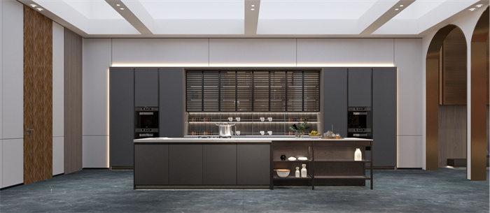 櫥柜+智能島臺(tái)的空間布局,既節(jié)省了空間,也優(yōu)化了家庭動(dòng)線。廚房一半采用了嵌入式柜體,考究的布局和純實(shí)木門(mén)讓餐廚空間簡(jiǎn)約大氣。島臺(tái)與烹飪區(qū)平行,空間明朗、清新自然。