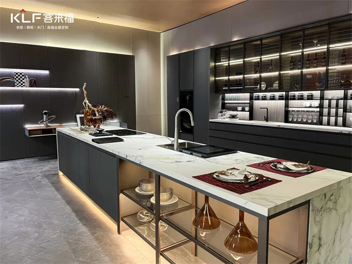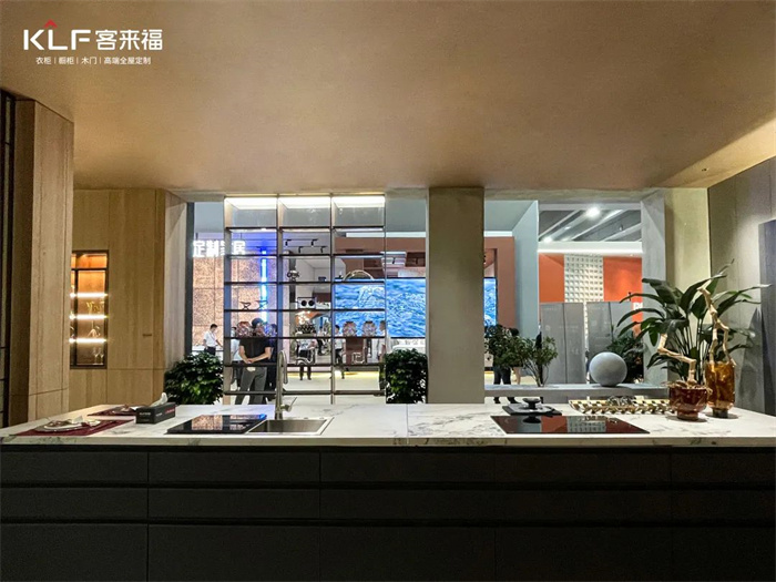 將客廳與開放式廚房打造成整體空間是升級(jí)的亮點(diǎn)之一,PET的工藝幫助我們實(shí)現(xiàn)嵌入式的內(nèi)置功能,比如衛(wèi)生間的燈光和冰箱。除此之外,整家定制也是客來(lái)福今年的著力點(diǎn),多功能的產(chǎn)品柜和開放式的設(shè)計(jì)模糊了空間界限。根據(jù)消費(fèi)者對(duì)于一站式一體化的消費(fèi)需求提供了解決方案。