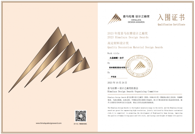近日,2023年喜馬拉雅?設(shè)計(jì)之巔獎(jiǎng)隆重盛啟,客來福定制家居受邀參與評(píng)選,在近千幅參評(píng)作品中脫穎而出。旗下作品“蝶變”系列入圍定制家居設(shè)計(jì)獎(jiǎng)、作品“臻·至系列”入圍居住空間設(shè)計(jì)獎(jiǎng)、作品“水晶蝴蝶”拉手入圍高定材料設(shè)計(jì)獎(jiǎng),得到了評(píng)審的一致好評(píng)。實(shí)力彰顯中國(guó)品牌設(shè)計(jì)力量。