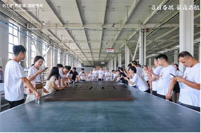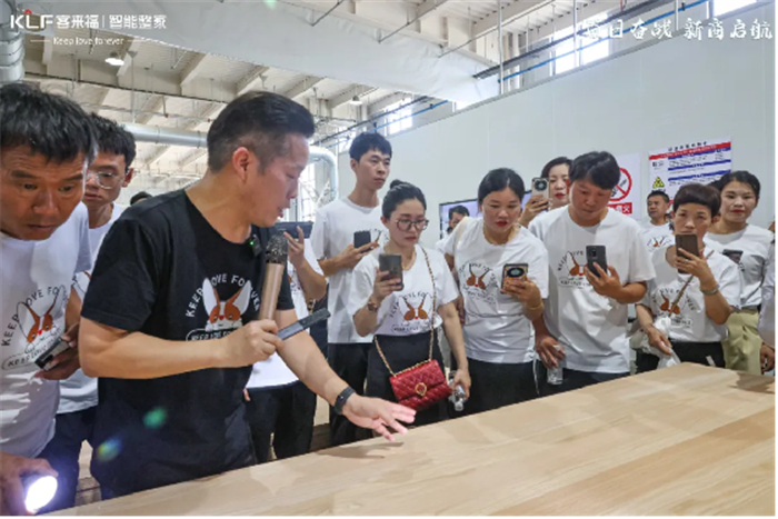 首站,大家來到了華東新橋生產基地。客來福董事長尹其宏先生指引參觀路線,帶領大家充分了解各車間生產狀況。期間,他熱情介紹了新橋智能家居產業(yè)園完善的生產流程以及硬核裝備,如最新引入的德國進口激光封邊機、木門自動生產線等,收獲經銷商伙伴的一致好評。
