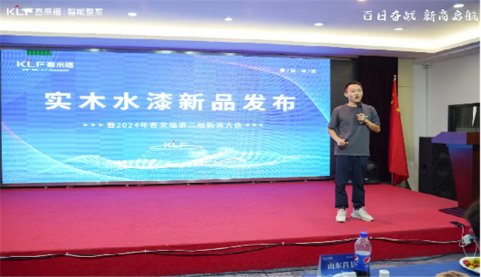 隨后,設計督導部主管張言發(fā)帶來實木水漆新品發(fā)布,現場詳細講解了新品采用的優(yōu)質天然木皮,環(huán)保水性漆涂裝及性能升級基材等多方面內容。未來,客來福將從差異化競爭迭代到優(yōu)異化競爭,以更出色的產品作為銷售保障,助力經銷商們放心“沖鋒”,斬獲訂單。