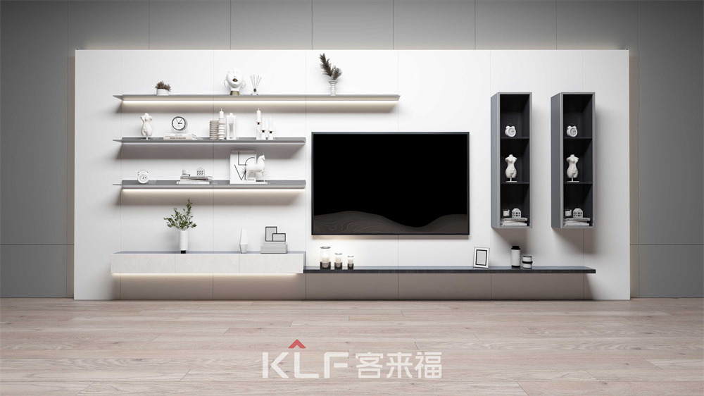 拉深構(gòu)造增加空間距離,以灰、白、黑三色為基調(diào),簡約風(fēng)格的基礎(chǔ)上更顯現(xiàn)代時尚輕奢。嵌入式電視背景墻設(shè)計,以黑為底打造沉穩(wěn)大氣的新風(fēng)韻。