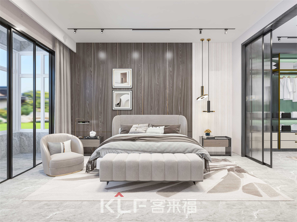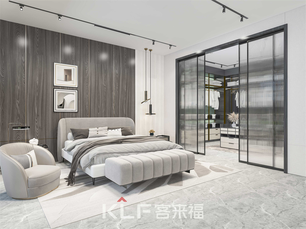臥室多使用深色系列,創(chuàng)造色彩差異,右側(cè)柵格的黑橘兩色,搭配輕奢風(fēng)的華貴與簡約低調(diào)碰撞出火花,每一處都擊中時尚潮流范。