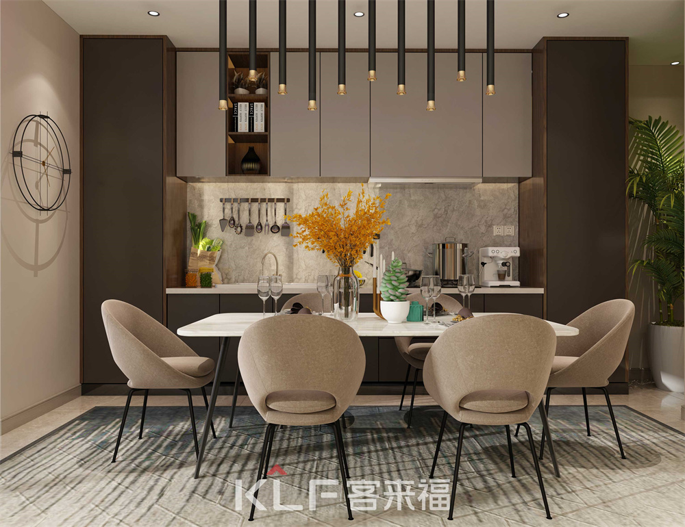 用餐時光是家中的溫馨時刻之一,而開放式的空間設(shè)計(jì)深受大眾歡迎。餐廳設(shè)計(jì)使用大量的米色,輔以精致的金屬裝飾、吊燈等,呈現(xiàn)了餐廳華麗的氛圍與格調(diào)。