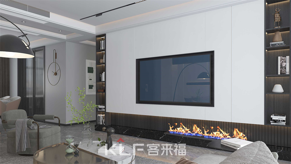 電視墻雖簡約質(zhì)樸,但也正因如此給整個(gè)客廳渲染出高端大氣的氛圍。兩邊的墻柜增加收納的功能,底部的火爐效果給空間帶去一絲生機(jī)活躍之感。