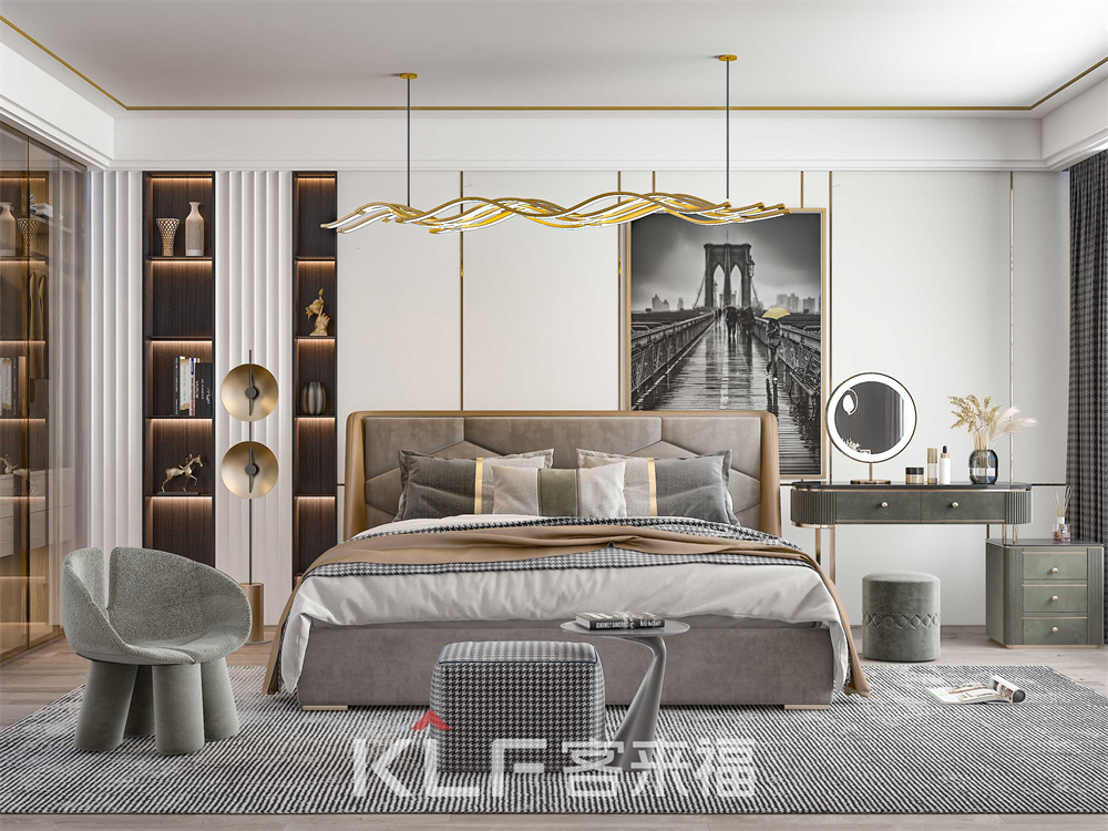 臥室采用不同于客廳書房的溫馨色調(diào),反而采用的現(xiàn)代金屬風(fēng)讓并無太多家居搭配的臥室,能夠?qū)⒑喖s與奢華共聚一身,且相處融洽。