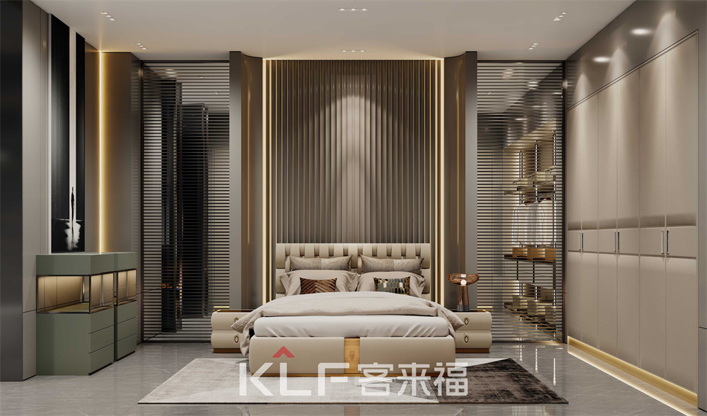 作為修養(yǎng)身心的家庭空間,墨奈系列臥室背景采用莫蘭迪水漆波浪板,造型低調(diào)又不失活潑,完美呈現(xiàn)出溫馨氛圍。搭配上意大利鋁包邊的大地色皮革門,彰顯出輕奢的生活態(tài)度,奢而不華,重在細(xì)節(jié)。
